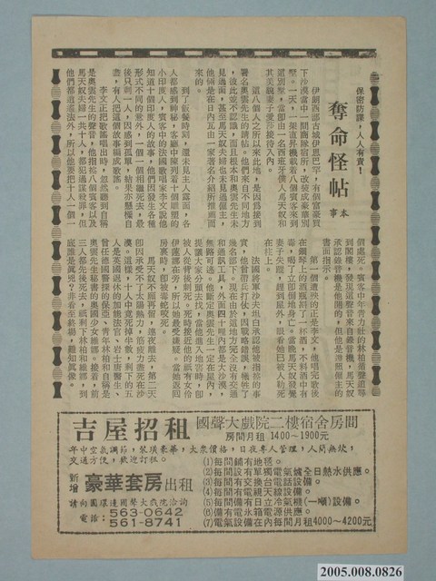 電影廣告單《哈泰利!》直幅單張雙面黑色印刷,外觀保存良好。 一面是「奪命怪鐵」本事。一面是樂聲戲院《哈泰利!》電影宣傳海報。 《哈泰利!》(Hatari! (1962))。一群男子在非洲捕獲野生動物並在雌性野生動物攝影師到來之前將它們出售給動物園,威脅要改變他們的方式。