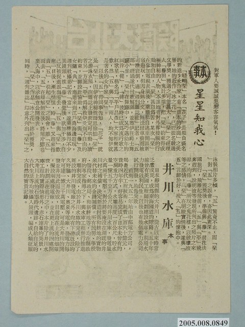 電影廣告單《魚河岸之石松》直幅單張雙面黑色印刷,外觀保存良好。 一面是「星星知我心」「井川水庫」本事。一面是台北大戲院《魚河岸之石松》電影宣傳海報。 《魚河岸之石松》(魚河岸の石松(1956))。連載在國內外時代雜誌宮本幹也的原作「女といふ城 夕子の巻」的館岡謙之助作脚色並由「ギラム」的小石栄一執導。