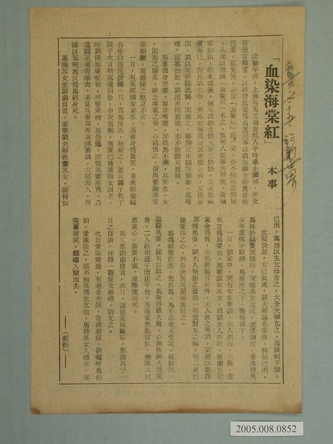 電影廣告單《秦良玉》直幅單張雙面黑白印刷,外觀保存良好。 一面是「血染海棠紅」本事,右側有黑筆跡。一面是新世界戲院《秦良玉》電影宣傳海報。 《秦良玉》(1953)。滇邊土司馬震南之嫡侄千乘參加苗族盛會,被女將秦良玉招為夫婿。南同窗樊龍調戲玉,被南怒斥。龍懷恨在心,挑撥播州土司襲南。乘、玉助南擊退敵軍,立下大功。