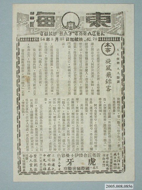 電影廣告單《少女集中營》直幅單張兩面黑白印刷,外觀保存良好。 一面是東海戲院「旋風飛鏢客」本事、「虎牙」電影宣傳。一面是《少女集中營》、「蘭嶼之歌」電影宣傳海報,及「盲劍與除奸」電影宣傳。 《少女集中營》。瑪麗碧姬、賈克漢生主演。