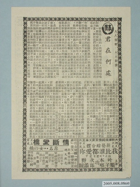 電影廣告單《關東女王蜂復仇》直幅單張兩面黑白印刷,外觀保存良好。 一面是「君在何處」本事,及「情斷愛橋」「我比誰都愛你」。一面是《關東女王蜂復仇》電影宣傳海報。 《關東女王蜂復仇》(女王蜂の逆襲(1961))。内田弘三「女巌窟王」的脚本,小野田嘉幹執導之動作片。攝影由「女王蜂と大学の竜」的岡田公直。