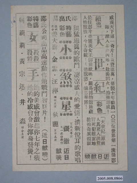 電影廣告單《續集大世紀》直幅單張兩面黑白印刷,外觀保存良好。 一面是樂民大戲院《豪勇七蛟龍》本事,及《大漢兒女》電影宣傳,上方有藍字跡「60.8.22」。一面是《續集大世紀》、《小煞星》、《女殺手》電影宣傳。