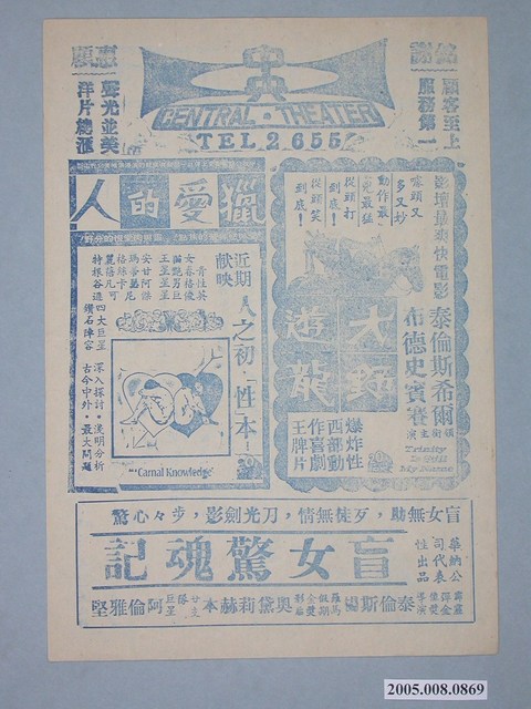 本件保存良好,為中央戲院出品,盲女驚魂記Wait Until Dark電影廣告單。電影由奧黛麗赫本Audrey Hepburn、阿倫雅堅Alan Arkin主演,導演為泰倫斯楊Terence Young。電影單宣傳為盲女無助,歹徒無情,刀光劍影,步步驚心。電影單其他部分為電影大野遊龍、獵愛的人、盲鏢客宣傳。