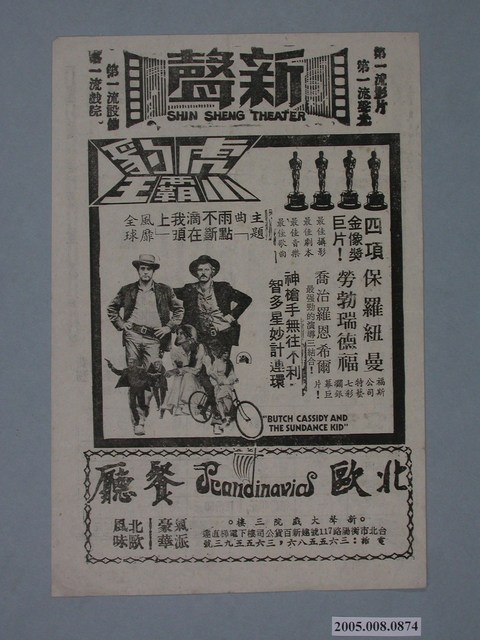 本件保存良好,為新聲出品,虎豹小霸王Butch Cassidy and the Sundance Kid電影廣告單。電影由保羅紐曼Paul Newman、勞勃瑞德福Robert Redford主演,導演為喬治羅恩希爾George Roy Hill。電影單宣傳為神槍手無往不利,智多星連環妙計。電影單其他部分為電影追憶、餐廳北歐餐廳、中韓餐廳宣傳。