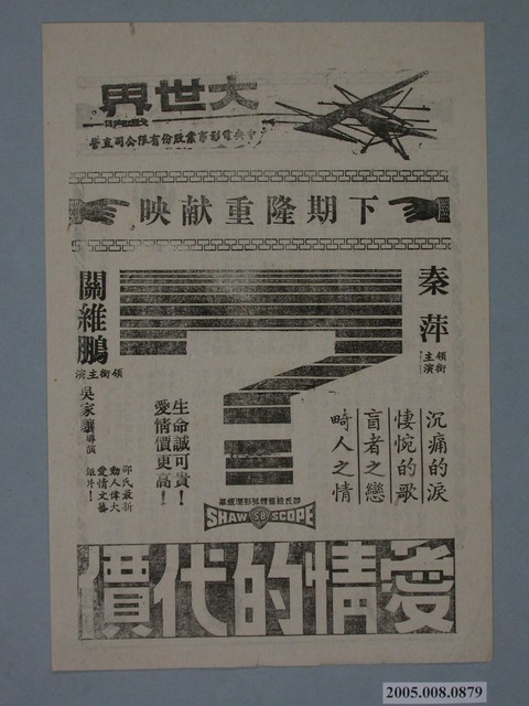 本件保存良好,為大世界戲院出品,愛情的代價電影廣告單。電影由秦萍、關維鵬主演,導演為吳家驤,邵氏出品。電影單宣傳為沉痛的淚,淒婉的歌,盲者之戀,畸人之情、生命誠可貴!愛情價更高!、邵氏最新動人愛情文藝鉅片!。電影單其他部分為電影五虎屠龍、報仇宣傳。