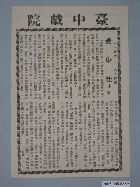 本件保存良好,為台中戲院出品,愛染桂(愛染かつら)電影廣告單。電影由岡田茉莉子、吉田輝雄主演,導演為中村登。宣傳歌曲為旅の夜風與悲しき子守唄。