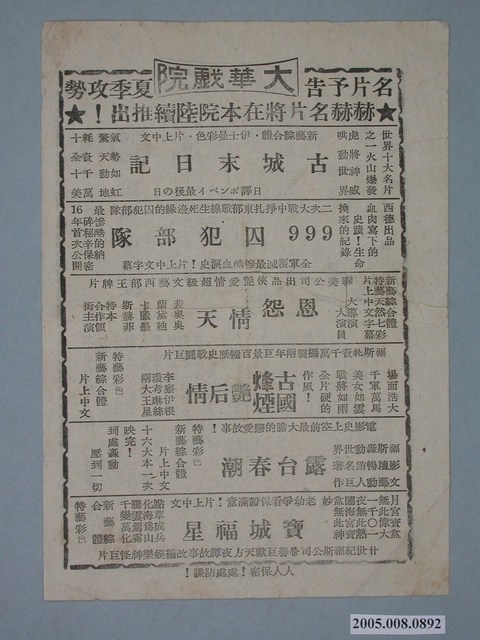 本件保存良好,為大華戲院出品,古城末日記Gli ultimi giorni di Pompei電影廣告單。電影由Steve Reeves、Christine Kaufmann主演,導演為 Mario Bonnard。電影單其他部分為電影999囚犯部隊、恩怨情天、古國烽煙艷后情、露台春潮、寶城福星、翠湖綺緣宣傳。
