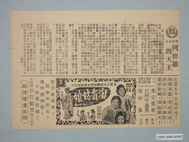 本件保存良好,為第一劇場出品,螢之光 螢の光電影廣告單。電影由若尾文子、市川和子、船越英二、菅原謙次主演,導演為森一生。電影單其他部分為電影阿修羅四天王、淘氣姑娘宣傳。