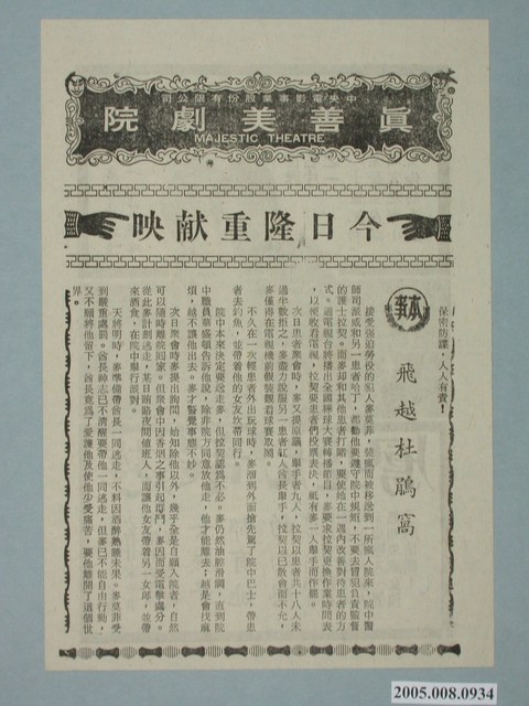 本件保存良好,為真善美劇院出品,遊龍戲鳳The Prince and the Showgirl 電影廣告單。電影由瑪麗蓮夢露Marilyn Monroe、勞倫斯奧利佛Laurence Olivier主演,導演為勞倫斯奧利佛Laurence Olivier。電影單其他部分為電影飛越杜鵑窩宣傳。