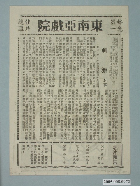 本件保存良好,為東南亞戲院出品,朋友再見Farewell, Friend/Adieu l'ami電影廣告單。電影由查理士布朗遜Charles Bronson、亞蘭德倫Alain Delon主演,導演為金惠曼Jean Herman。電影單其他部分為電影刺激宣傳。