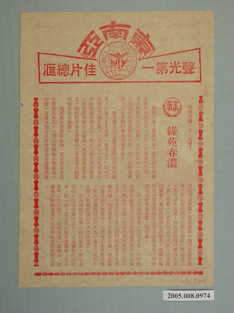 本件保存良好,為東南亞戲院出品,屋頂上的提琴手Fiddler on the Roof電影廣告單。電影由陶坡爾Topol、李奧納費雷Leonard Frey、諾瑪克萊恩Norma Crane、羅莎琳赫麗絲Rosalind Harris、米屈麗瑪西Michele Marsh、妮娃絲摩兒Neva Small、麥克葛瑞洛Michael Glaser主演,導演為諾曼傑威遜Norman Jewison。電影單其他部分為電影綠苑春濃宣傳。