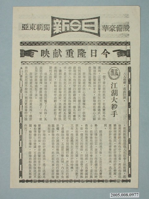本件保存良好,為日新出品,一襲灰衣萬縷情The Man in the Gray Flannel Suit電影廣告單。電影由葛雷哥萊畢克Gregory Peck、珍妮佛瓊斯Jennifer Jones、佛烈德馬區 Fredric March主演,導演為亨利高士達。電影單其他部分為電影江湖大殺手宣傳。