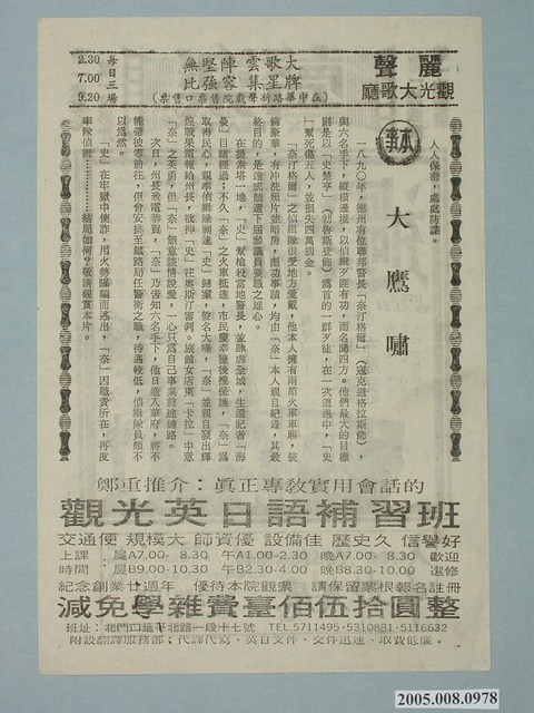本件保存良好,為樂聲出品,誰之過Born Innocent電影廣告單。電影由琳達布麗兒Linda Blair主演,導演為Donald Wrye。電影單其他部分為電影大鷹嘯、餐廳中韓餐廳、觀光英日語補習班宣傳