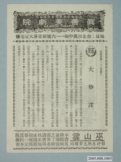 本件保存良好,為真善美劇院出品,巫山雲 The Story of Adele H/L'histoire d'Adèle H電影廣告單。電影由Isabelle Adjani主演,導演為弗朗哥杜魯福François Truffaut。電影單其他部分為電影大妙諜宣傳。