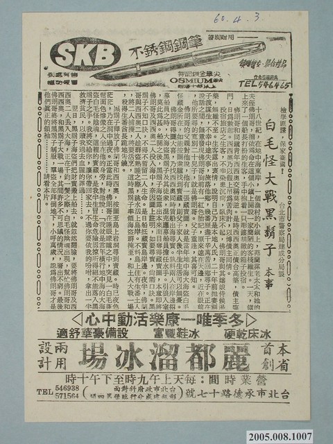 1.臺北中央戲院1970年代提供觀眾的電影本事,雙面印刷。一面是本期上映的《白毛怪大戰黑鬍子》的電影本事,描述在地中海東岸的漁村小鎮裡,兩名青年喜獲藏寶圖展開海上冒險而與海盜黑鬍子、陰魂白毛怪相遇所發生的故事;而同面上下方則有SKB不銹鋼鋼筆及麗都溜冰場的廣告,最上方寫有「60.4.3」日期字樣。另面為下期上映的《火雷破山海》(Krakatoa: East of Java)電影簡介,包括影評、製片、導演、演員等介紹,是一部由勃納柯瓦斯基(Bernard L. Kowalski)執導,麥斯米倫雪兒(Maximilian Schell)、黛安貝克(Diane Baker)等主演,描述1883年爪哇島火山爆發所引發故事的美國災難片。