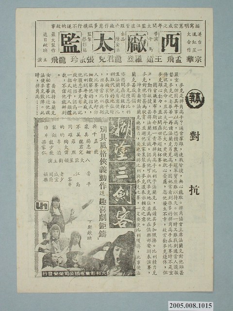 本件保存良好,為國民大戲院出品,大活寶 電影廣告單。電影由杜菲歐、羅西華蘇珊主演。電影單其他部分為電影巨斧、對對胡、西廠太監、對抗、糊塗三劍客宣傳。
