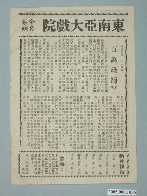 本件保存良好,黑白雙面印刷,為東南亞大戲院出品百萬雄師電影本事,其他部分為電影紅塵電影宣傳。