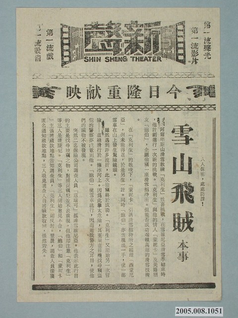 本件保存良好,黑白雙面印刷,為新聲戲院出品雪山飛賊電影本事,其他部分為電影祕密的性宣傳。