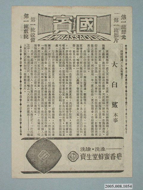 本件保存良好,黑白雙面印刷,為國賓戲院出品大白鯊Jaws電影本事,由Roy Scheider、Robert Shaw主演,導演為史蒂芬史匹柏 Steven Spielberg。其他部分為電影朱門巧婦宣傳、資生堂廣告。