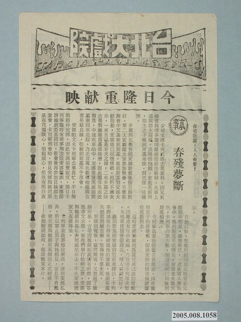 本件保存良好,黑白雙面印刷,為台北大戲院出品春殘夢斷電影本事,其他部分為電影大都會宣傳。