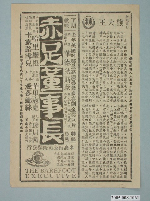 本件保存良好,黑白雙面印刷,為國民大戲院出品熊大王電影本事,其他部分為電影木偶奇遇記、韓國怪談、暴君焚城錄、赤足董事長宣傳。