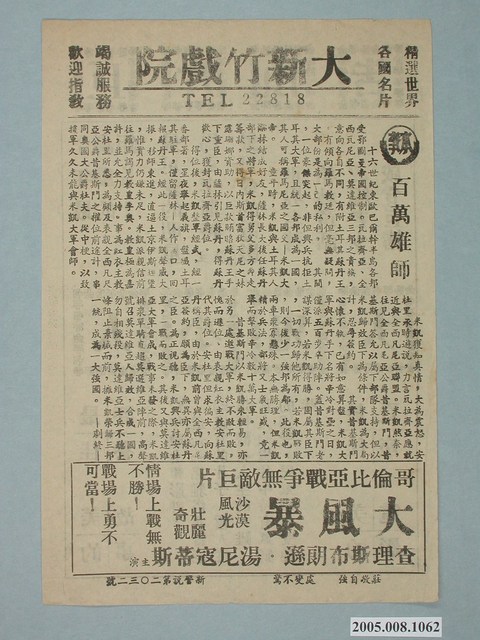 本件保存良好,黑白雙面印刷,為大新竹戲院出品百萬雄師電影本事,其他部分為電影人小鬼大、大風暴宣傳。