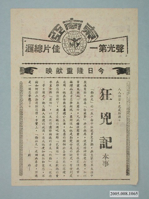 本件保存良好,黑白雙面印刷,為東南亞戲院出品狂兇記電影本事,其他部分為電影大雷雨宣傳。