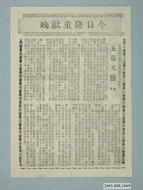 本件保存良好,黑白雙面印刷,為寶宮戲院出品五毒天羅電影本事,其他部分為電影工廠大姐宣傳。