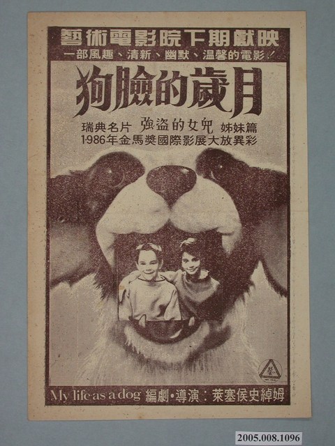 本件保存良好,黑白雙面印刷,為藝術電影院出品狗臉的歲月Mitt liv som hund電影廣告單,其他部分為電影蒙娜麗莎-神女、人性、愛影評。