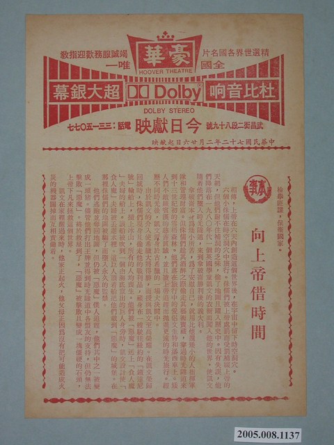 本件保存良好,黑白雙面印刷,為豪華戲院出品向上帝借時間電影本事,其他部分為電影窈窕淑男宣傳。