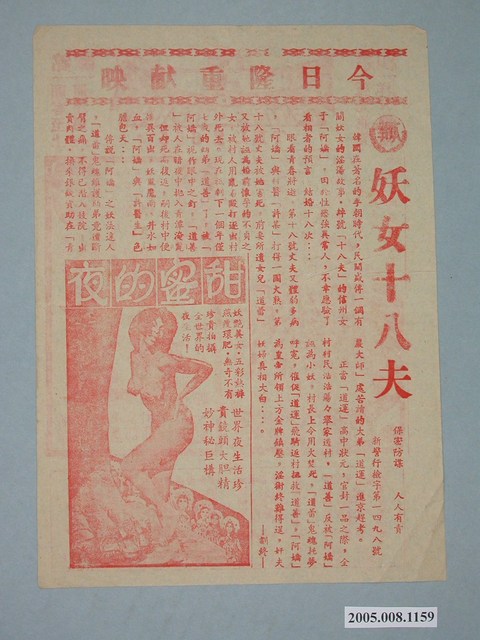 1.新竹中央戲院1970年代提供觀眾的電影本事,雙面印刷。一面是本期上映的韓國片《妖女十八夫》的電影本事,該片描述一名李朝時代民間盛傳淫蕩妖女「阿嬌」結婚十八次的故事。而同面左側另有《甜蜜的夜》電影劇照及文字廣告。另面則是下期上映的兩部電影文案廣告,包括湯尼寇蒂斯、娜妲麗華、傑克李蒙主演的美國片《瘋狂大賽車》(The Great Race);以及史都華懷曼、露絲瑪麗科史芙、羅勃韋納、約琵夫考頓主演的美國動作片《海底迷城》(City Beneath the Sea)。
