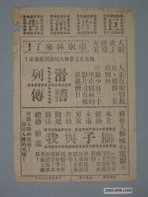1.大新竹戲院1970年代提供觀眾的電影本事,雙面印刷。一面為《野狼》的電影本事,描述1873年一名混血紅蕃在古老蠻荒土地上逃亡戰鬥的故事。而同面下方有《世界女子摔角最新冠軍賽》的文字廣告。另面則是下期上映的英國片《滑稽列傳》(A King in New York)及《獅子與我》(Born Free)的電影文案廣告,前者為由卓別林(Charles Chaplin)主演的喜劇片,後者則是哥倫比亞電影公司出品,描述一對夫妻與三頭少獅的悲喜劇。