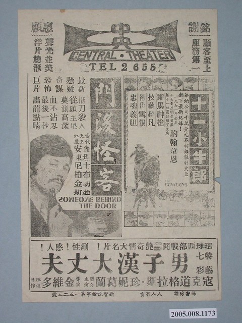 本件保存良好,黑白雙面印刷,為中央戲院出品江湖浪子電影本事,其他部分為電影十一小牛郎、門後怪客、男子漢大丈夫、吾愛吾師宣傳。