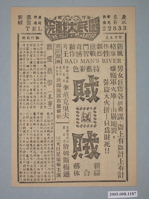 本件保存良好,黑白雙面印刷,為國民大戲院出品敢愛敢恨電影本事,其他部分為電影賊賊、安娜的冒險、太陽兄弟宣傳。