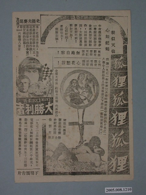 本件保存良好,為華揚戲院出品,狐狸狐狸狐狸電影廣告單。電影由露絲坦普霖、珍妮佛碧霞、偷雲尼主演,導演為約翰卡洛斯。電影單其他部分為電影獸王野女電影本事。
