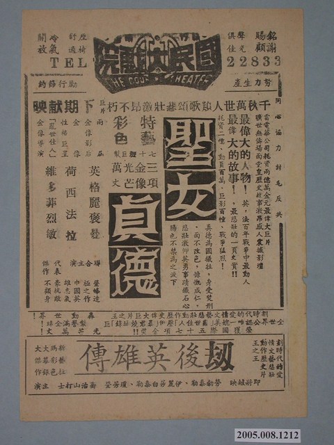 本件保存良好,為國民大戲院出品,聖女貞德 Joan of Arc電影廣告單。電影由英格麗褒曼 Ingrid Bergman、荷西法拉 José Ferrer主演,導演為維多菲列敏 Victor Fleming。電影單其他部分為電影劫後英雄傳、密警、傻瓜大鬧世運會電影本事。