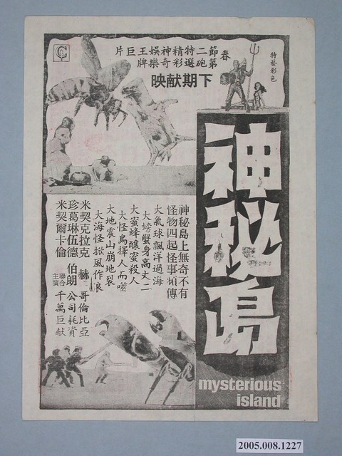 本件保存良好,為豪華戲院出品,神秘島 Mysterious Island電影廣告單。電影由米契克拉克 Michael Craig、珍葛林伍德 Joan Greenwood、米契爾卡倫 Michael Callan、赫伯朗 Herbert Lom主演,導演 Cy Endfield。電影單其他部分為電影零零七金鎗人電影本事。