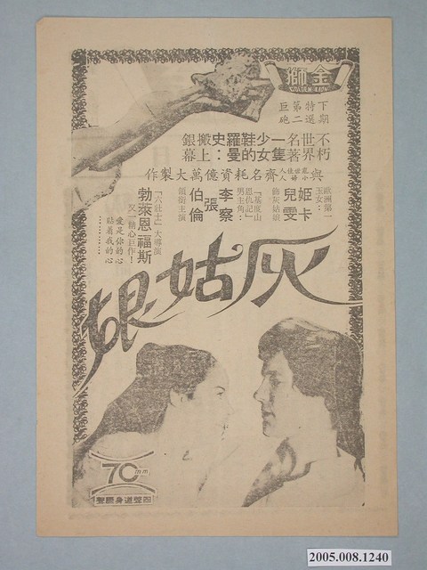 本文物為《灰姑娘》電影廣告單,勃萊恩福斯執導,姬瑪卡兒雯、李察張伯倫領銜主演。標題寫著「不朽世界名著一隻少女鞋的羅曼史:搬上螢幕」、「與亂世佳人小婦人齊名耗資億萬大製作」等字樣。圖片為電影中演員們的演出樣貌。背面為《賣命生涯》本事,講述電影的故事情節內容。