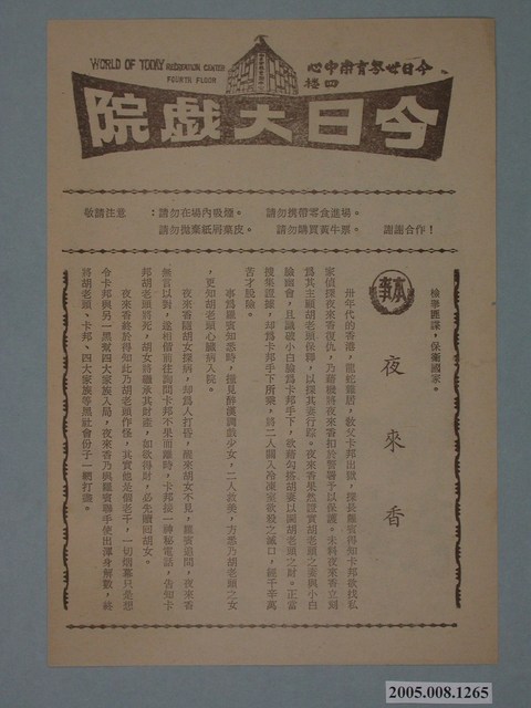 本件保存尚可,為今日大戲院出品,吾家有女初長成電影廣告單。電影由彭雪芬、亞倫(譚詠麟)主演,導演為蘇月禾。電影單其他部分為電影夜來香電影本事。