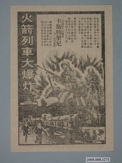 本件保存良好,為國賓戲院出品,火箭列車大爆炸電影廣告單。導演為卡斯特里尼。電影單其他部分為電影周末的狂熱電影本事。