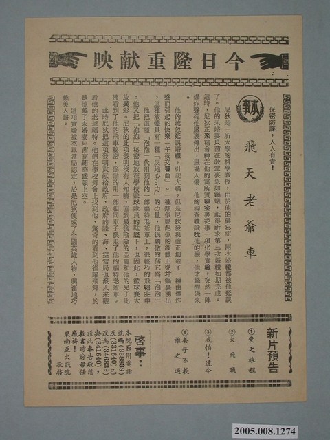 本件保存良好,為東南亞戲院出品,埃及豔后 Cleopatra電影廣告單。電影由伊莉莎白泰勒 Elizabeth Taylor、李察波頓 Richard Burton、雷克哈里遜 Rex Harrison主演,導演為Joseph L. Mankiewicz。電影單其他部分為電影飛天老爺車電影本事。