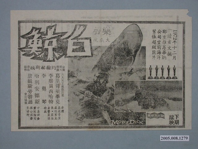 本件保存良好,為樂聲戲院出品,白鯨 Moby Dick電影廣告單。電影由葛里哥萊畢克 Gregory Peck、李察貝西哈特 Richard Basehart、李奧琴 Leo Genn、哈利安德斯 Harry Andrews、詹姆勞勃遜 James Robertson Justice主演,導演為約翰赫斯頓 John Huston。電影單其他部分為電影大法師電影本事。