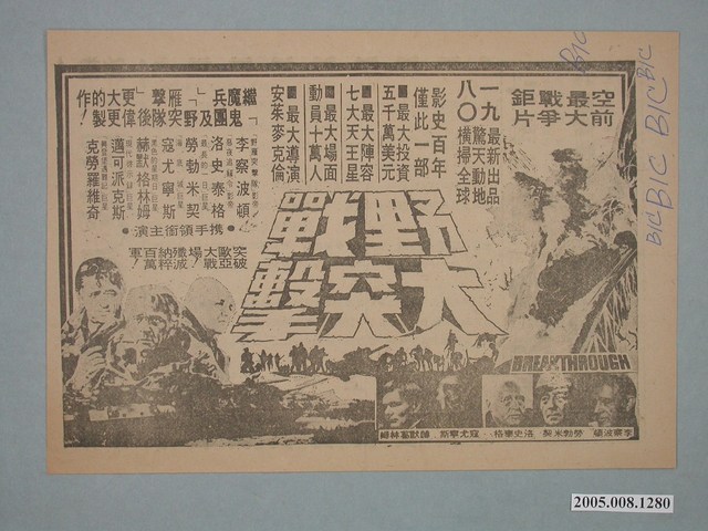 本件保存良好,為樂聲戲院出品,野戰大突擊 Steiner - Das Eiserne Kreuz, 2. Teil電影廣告單。電影由李察波頓 Richard Burton、洛史泰格 Rod Steiger、勞勃米契 Robert Mitchum、寇尤寧斯、赫默格林姆 Helmut Griem、邁可派克斯 Michael Parks、克勞羅維奇 Klaus Löwitsch主演,導演為 Andrew V. McLaglen。電影單其他部分為電影一九四一電影本事。
