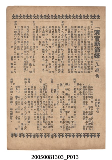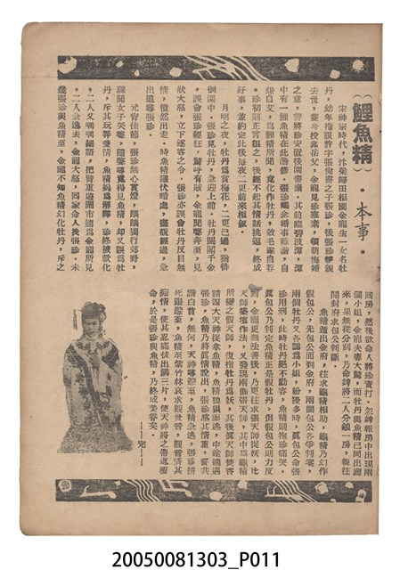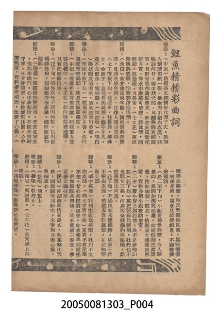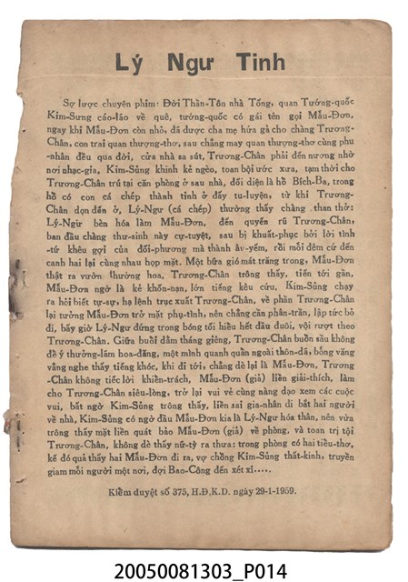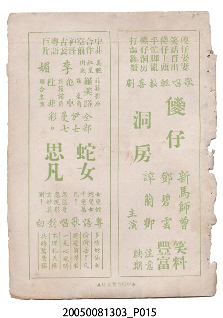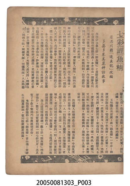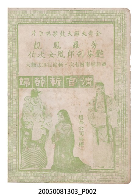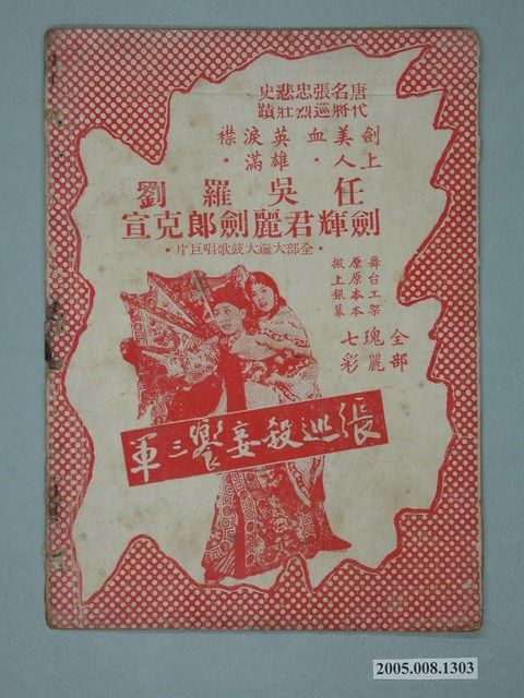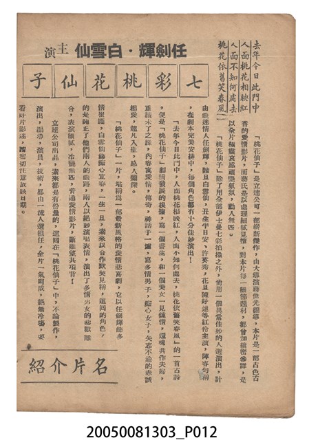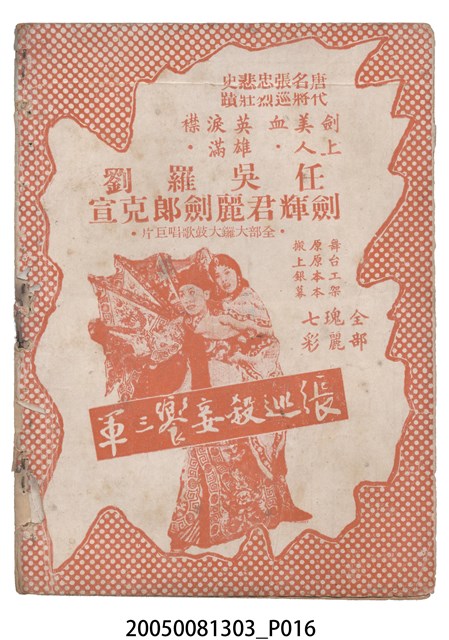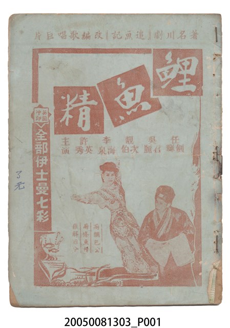 本件保存良好,彩色印刷,為鯉魚精電影本事。電影由任劍輝、吳君麗、靚次伯、李海泉、許英秀主演,導演為黃鶴聲。背面為電影張巡殺妄饗三軍。