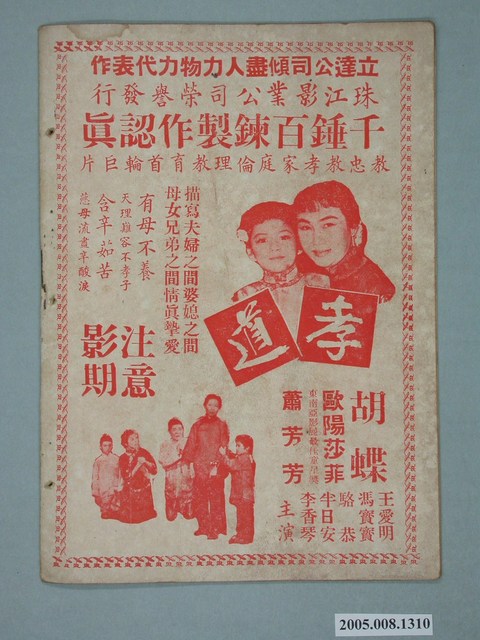 本文物為《美人計》電影本事,講述電影的故事情節內容,標題寫著「三國歷史熱鬧雄壯古裝歌唱鉅片」,圖片為電影中演員們演出樣貌和劇情場景的畫面,下方寫有12位主演者名字。背面是《孝道》的電影介紹,胡蝶、歐陽莎菲、蕭芳芳主演,標題寫著「立達公司傾盡人力物力代表作」、「珠江影業公司榮譽發行」以及「教忠教孝家庭倫理教育首輪巨片」等字樣。