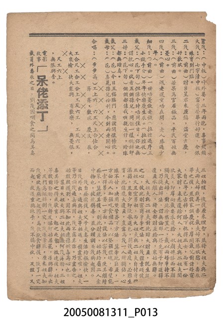 本件保存良好,彩色印刷,為呆佬添丁電影本事。電影由劉醒波、紫羅蓮、少新權主演,導演為吳回。背面為電影魚腸劍。