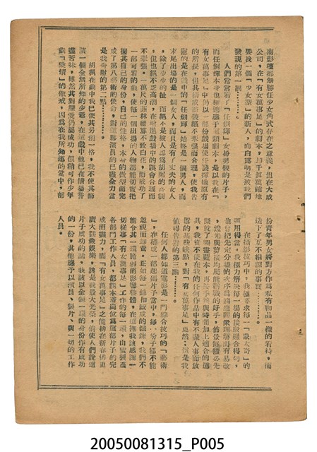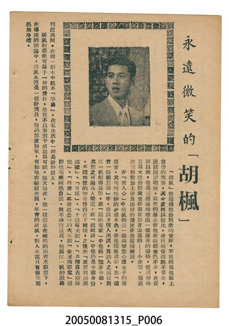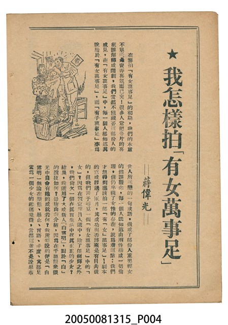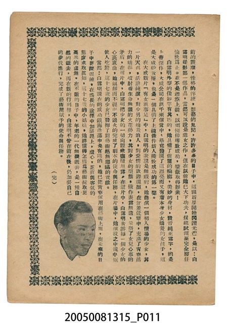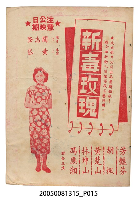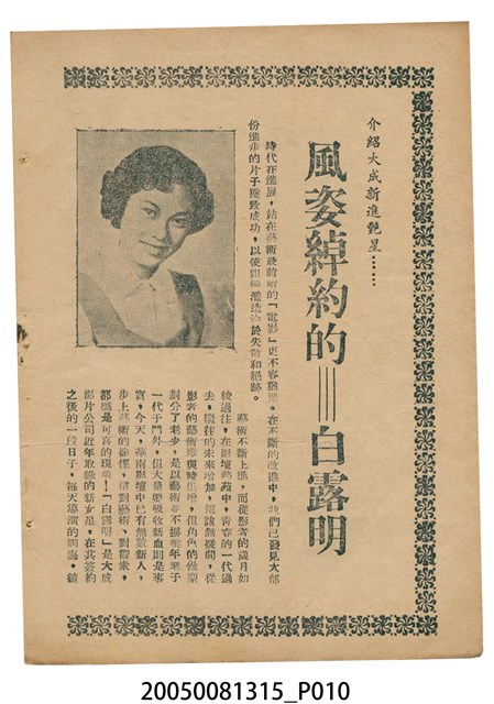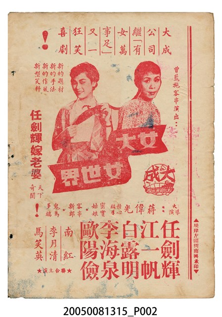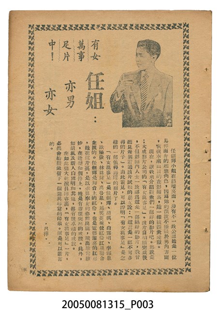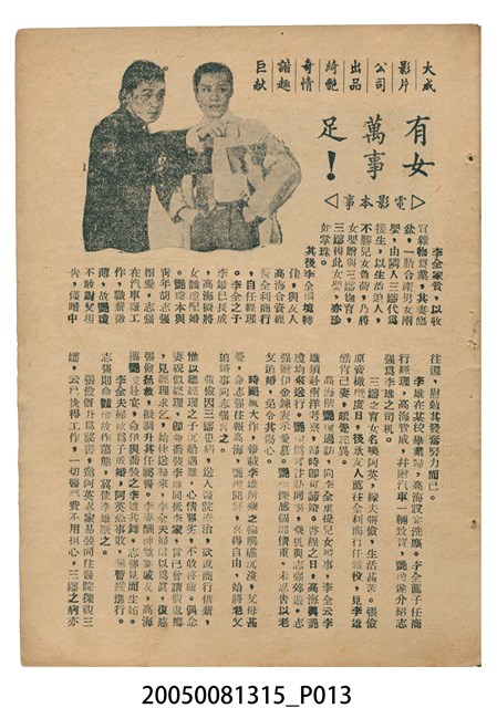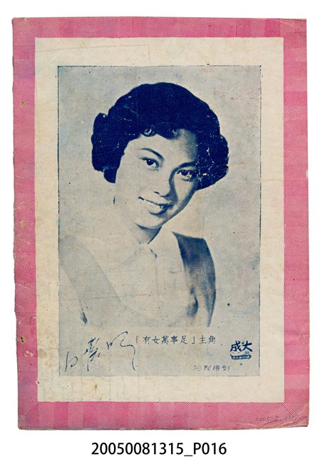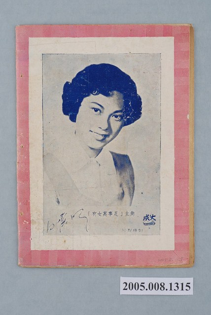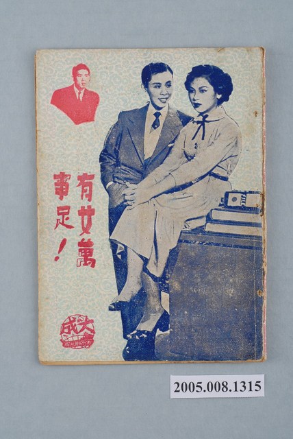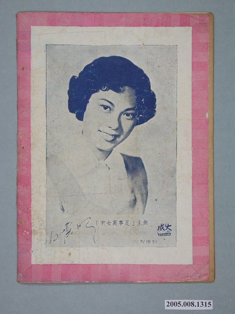 本件保存良好,彩色印刷,為有女萬事足電影本事。電影由任劍輝、白露明主演,導演為蔣偉光。正面印有大成影業商標,背面為電影女主角白露明的照片。