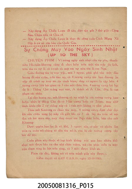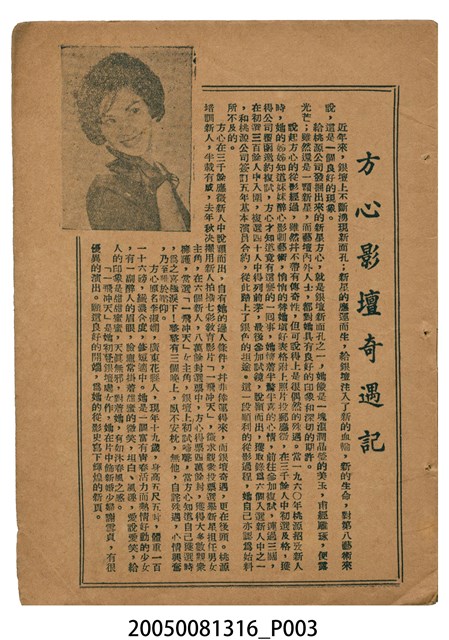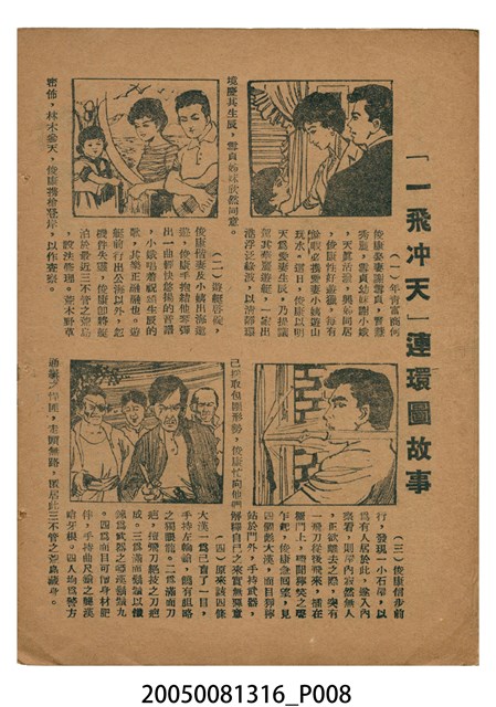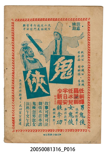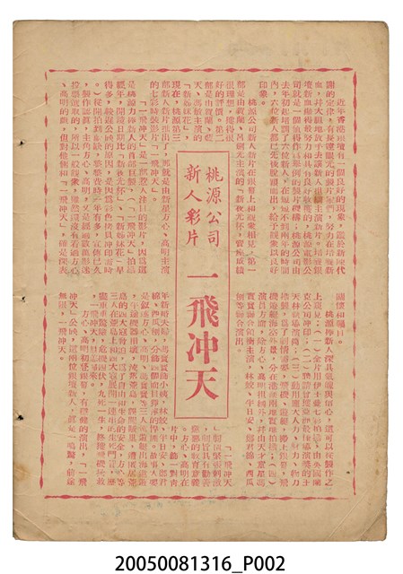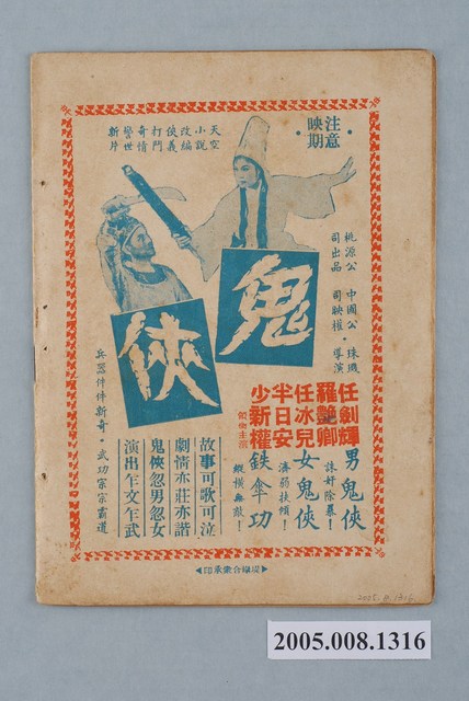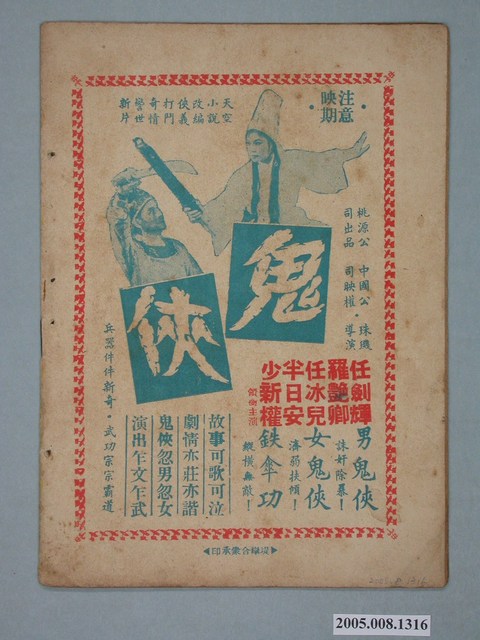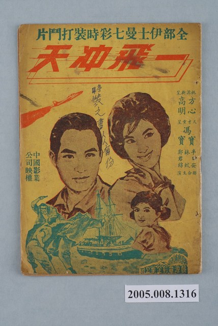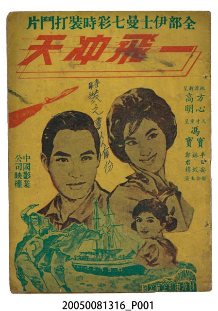 本件保存良好,彩色印刷,為一飛沖天電影本事。電影由方心、高明、馮寶寶主演,導演為王天林。正面寫有時裝之書人人有份,背面為電影鬼俠。