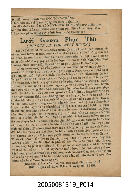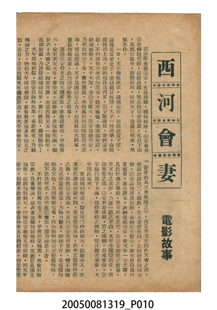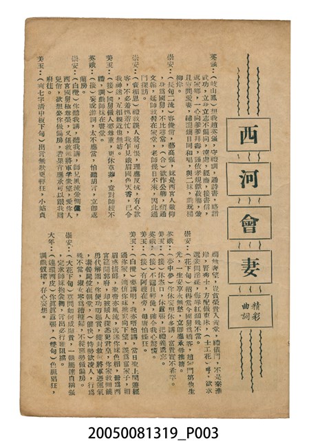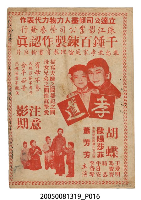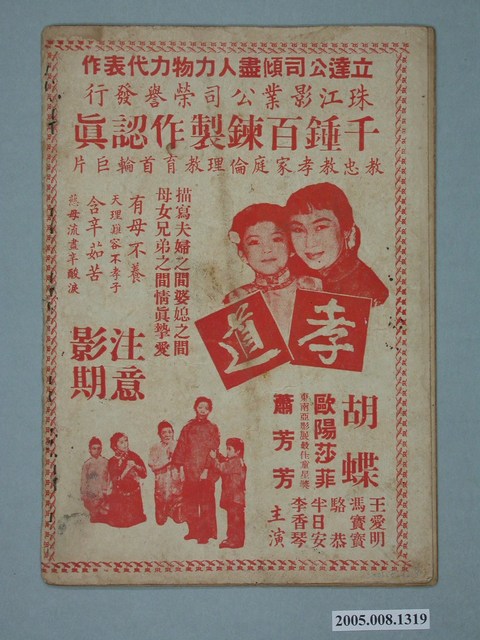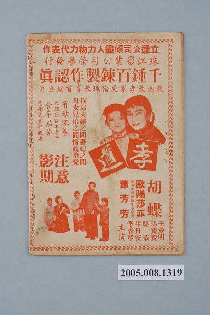 本件保存良好,彩色印刷,為西河會妻電影本事。電影由任劍輝、任冰兒、羅艷卿、靚次伯主演,導演為龍圖。背面為電影孝道。