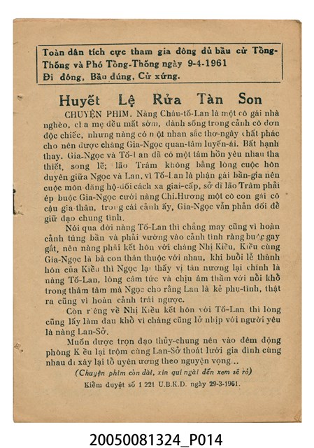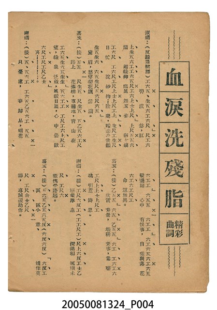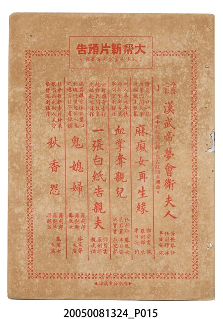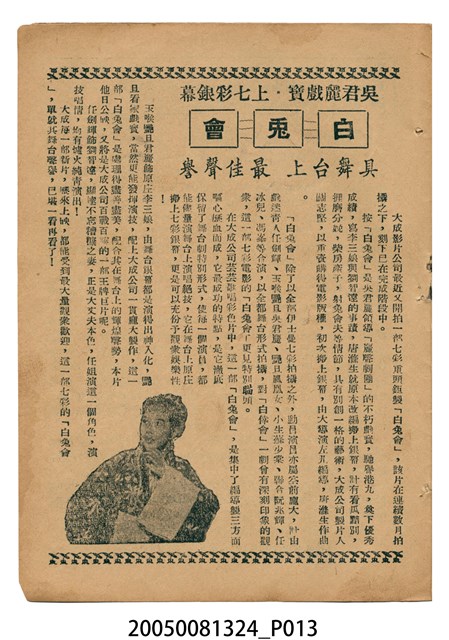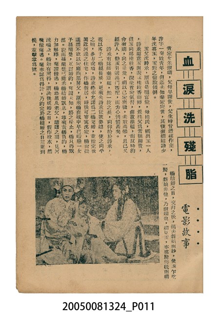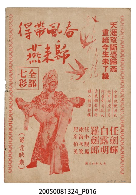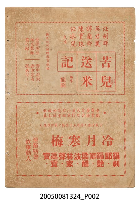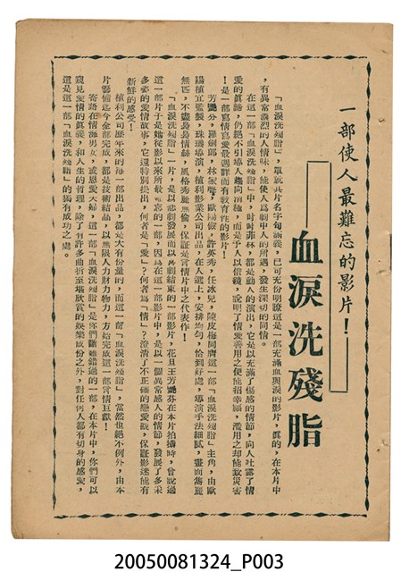 本件保存良好,彩色印刷,為血淚洗殘脂電影本事。由黎聞、芳艷芬主演,導演珠璣,三多影業出品。背面為電影春風帶得歸來燕。